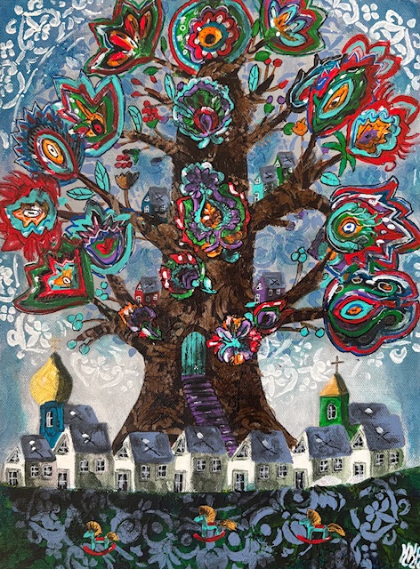 Malowany farbami akrylowymi na płótnie, sygnowany, podpisany na odwrocie.